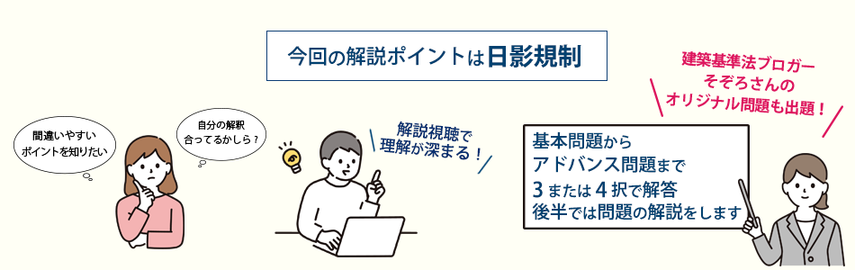 『高さ制限 法規deチャレンジ』は、天空率や日影規制なども含めた高さ制限について、オンタイムで参加しながら学ぶイベント形式のセミナーです。基本的なことから少しアドバンス的な内容まで、弊社サポートセンターへよくある質問を中心に、専門スタッフが伝えたいポイントを元に問題を作成いたしました。