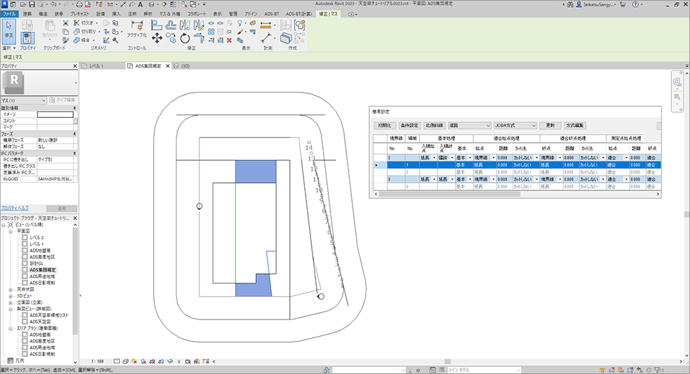 | 与条件編集 | ・敷地登録、境界線条件、道路及び交差点設定、用途地域・高度地区・地盤面高・日影規制 (各分割可能)、日照条件、緯度経度、方位はRevitの機能に依存 |