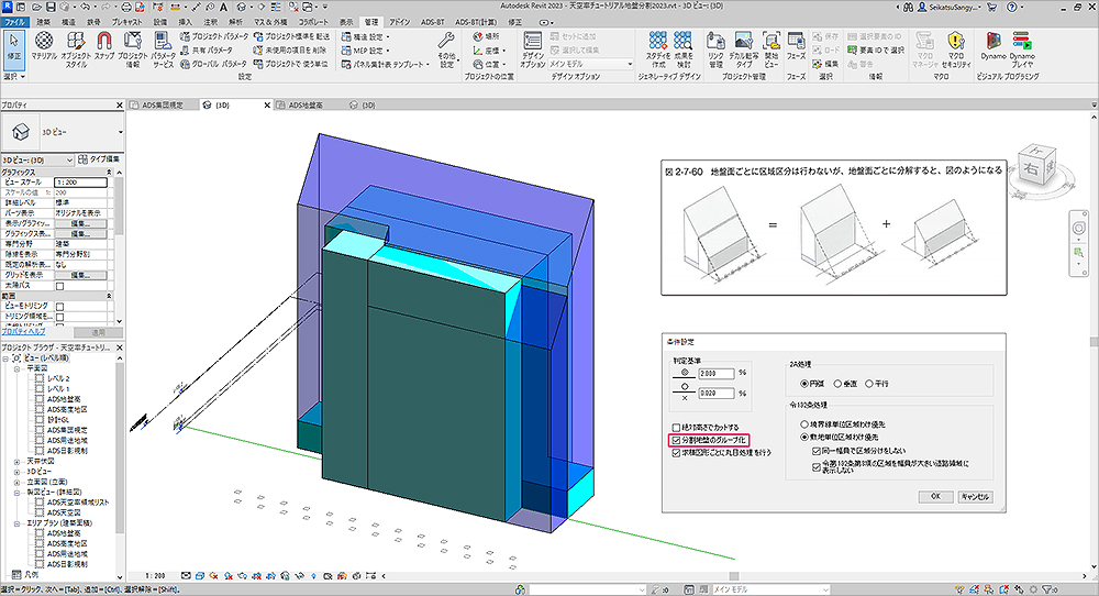 Revit2021対応版から地盤面ごとに区域区分を行わない天空率算定領域の自動生成に対応し、複数の天空率算定領域を一つにまとめるグループの機能を強化しました。 従来は手動での設定が必要であった複雑な天空率算定領域の設定が容易になりました。