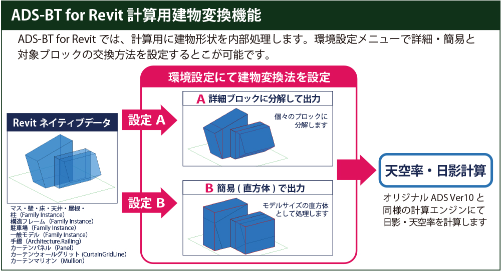 ・与条件及び計算結果等の図形情報は、Revit のオブジェクトによる管理 ・ADS-winとのインポート及びエクスポート機能 ・Autodesk Revit LTには非対応 ・敷地・道路形状、その他条件や建物形状等により各種計算が出来ない場合があります ・計算対象となる建物(Revitのモデル)によって計算時間がかかる場合があります ・ライセンス管理は、スタンドアロン版、ネットワーク版共にプロテクトキー(CodeMeter)を使用 ・操作サポート対象バージョン:Revit2026.2025.2024.2023 |